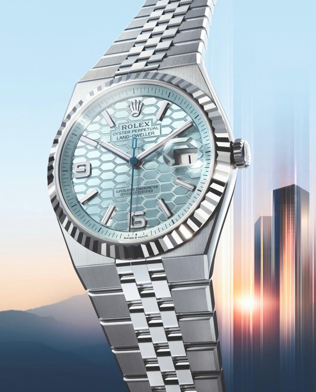 El Land-Dweller, impregnado de audacia y con la vista puesta en el futuro, redefine los parámetros de la perfección relojera según Rolex. Encarna la filosofía de abrazar el momento presente al tiempo que se construye el futuro. El mensaje que transmite es sencillo pero potente: estar en sintonía con su tiempo, con su entorno, para construir el mundo del mañana. Demuestra, además, la capacidad de la marca para perfeccionar su savoir-faire de forma perpetua. La primera modalidad presentada es un Land-Dweller 40 en versión Rolesor blanco (combinación de acero Oystersteel y oro blanco). Está provista de un bisel estriado, así como de una esfera blanco intenso con motivo “nido de abeja”. La segunda, un Land-Dweller 36, está realizada en oro Everose de 18 quilates. Luce una esfera idéntica, aunque cuenta con 10 brillantes de talla baguette engastados a modo de índices y un bisel que resplandece con el fuego de 44 diamantes talla trapecio. La tercera modalidad, fabricada en platino 950, es un Land-Dweller 40 dotado de un bisel estriado y una esfera azul glaciar (un color reservado a los relojes elaborados en este prestigioso metal), también con motivo “nido de abeja”.