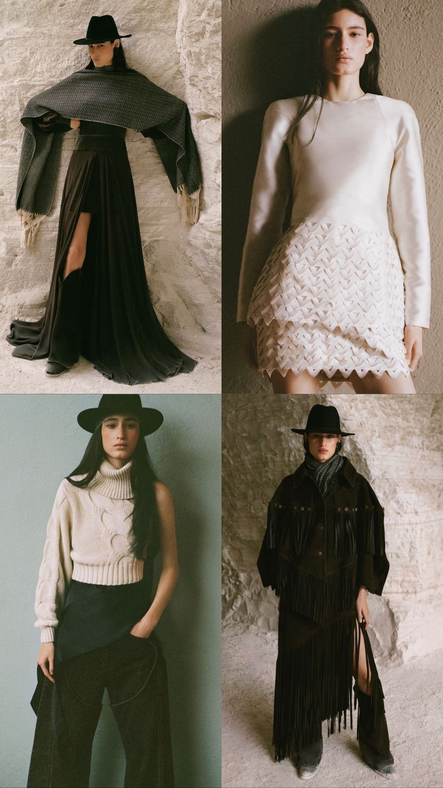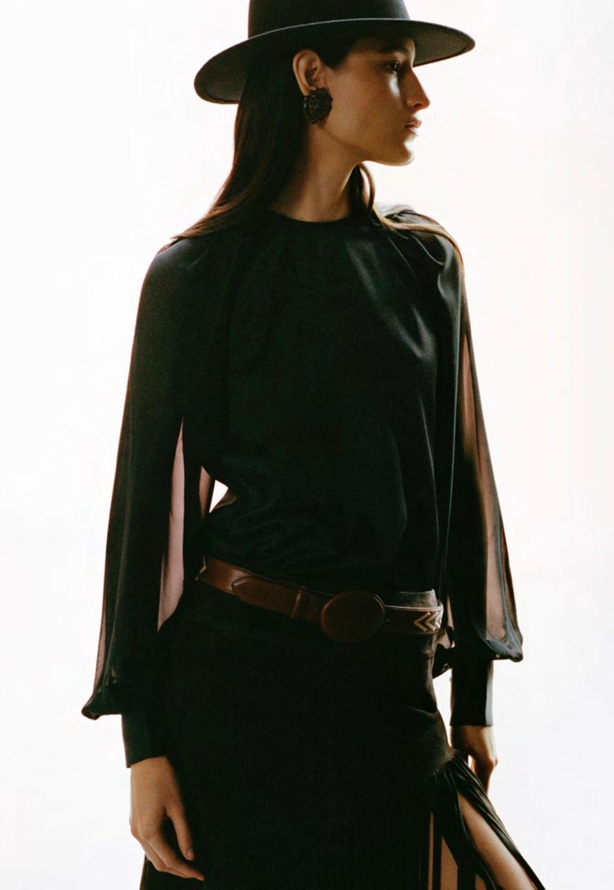 Hay bombers de mezclilla, botas vaqueras, blusas y vestidos drapeadas, que trazan la silueta de una mujer segura, elegante, elevando emociones con colores terrosos y neutros, que nos recuerdan paisajes y desiertos de nuestro país. ¡Nos invita a todas a disfrutar de sus creaciones!
